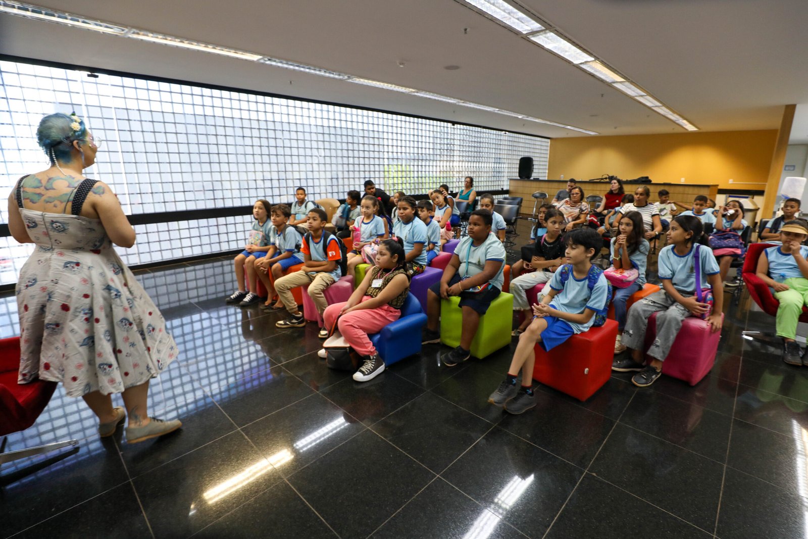 Cada criança chegou com seu livro preferido em mente. Mas, durante a visita, eles ouviram novas histórias da “Anil e as histórias mágicas do Dinossauro de Baunilha”. No foyer do auditório, uma mulher de cabelos azuis e flores na cabeça começou a encantar com as palavras. Era Carla Nery, a contadora de histórias, que convidou a turma para conhecer Maumau, o Lobo-Guará do Cerrado.