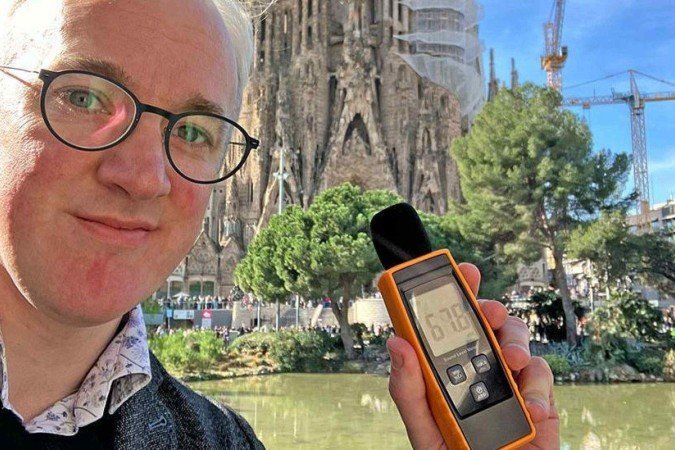 Natalie Mueller, do Institute for Global Health de Barcelona, me leva para uma caminhada pelo centro da cidade. Começamos em uma rua movimentada — meu medidor de som marca mais de 80 decibéis —, e seguimos para uma avenida tranquila e arborizada, onde o barulho cai para a casa dos 50 decibéis.