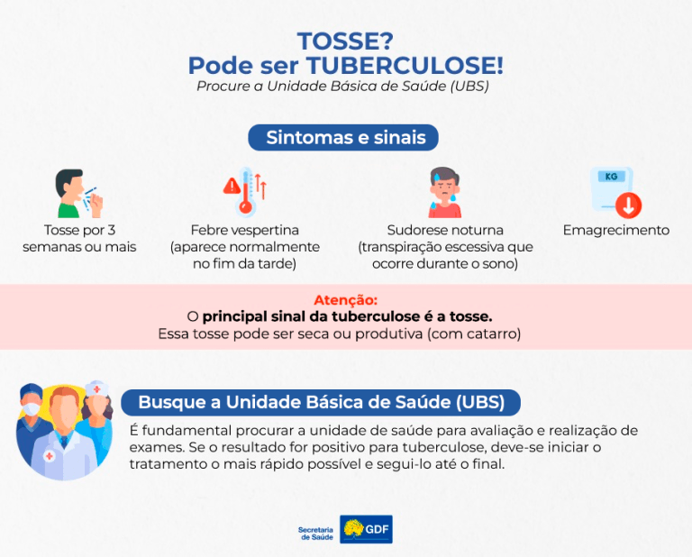 Caso a tosse siga por mais de três semanas, é necessário procurar atendimento em uma das 176 unidades básicas de saúde (UBSs) do DF. “A tuberculose é uma doença que pode ser diagnosticada em qualquer idade. É fundamental manter o vínculo com as equipes de Saúde da Família (eSF)”, explica o responsável técnico pela tuberculose na Gerência de Vigilância das Infecções Sexualmente Transmissíveis (Gevist) da SES-DF, Ricardo Gadelha.