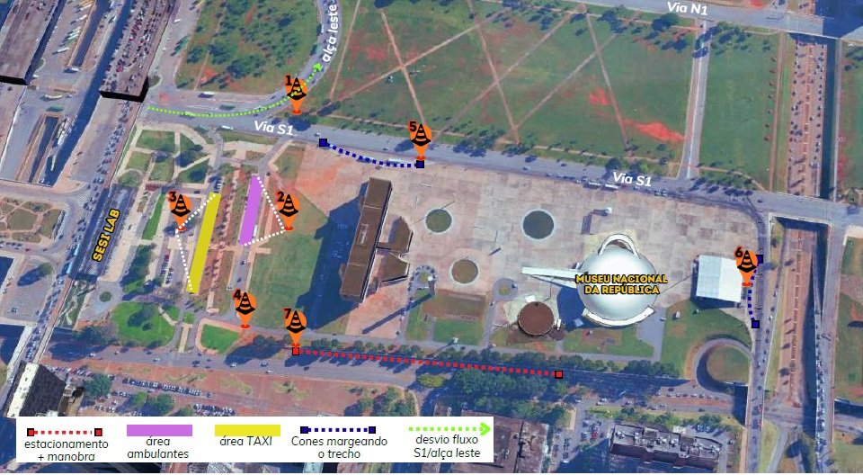 2Em razão de eventos culturais e esportivos que serão promovidos entre quinta-feira (20) e domingo (23), as equipes de fiscalização do Departamento de Trânsito do Distrito Federal (Detran-DF) realizarão intervenções em vias da Esplanada dos Ministérios e do Parque da Cidade.Consciência Negra 2025De quinta-feira (20) a sábado (22), o Museu Nacional da República recebe o festival Consciência Negra 2025. Em razão do evento, o Detran-DF implantará sinalização viária nas imediações e realizará patrulhamento nas vias próximas para garantir a fluidez e a segurança no trânsito.Nas vias entre o Museu Nacional e o Sesi Lab serão sinalizadas áreas para vendedores ambulantes e estacionamento para táxi. Os agentes também sinalizarão dos pontos de embarque e desembarque de passageiros próximos ao Museu. Na via S2, será delimitado um espaço para estacionamento e manobra. Durante o evento, o fluxo da via S1 será desviado para a alça leste da Rodoviária.Corrida Maratona MonumentalNeste sábado (22), em razão da corrida Maratona Monumental, que contará com percursos de 5 km e 10 km, pelas vias: S1, Palácio Presidencial e N1. A largada e a chegada dos participantes ocorrerão na Esplanada dos Ministérios, na altura do Bloco C.Arte: Detran-DFA partir das 17h, a via S1 será bloqueada e o fluxo de veículos será desviado para a alça leste da Rodoviária. O tráfego que segue pela via L2 Sul, sentido Esplanada, será direcionado para o Buraco do Tatuí. Na Esplanada, a faixa mais à direita será destinada à saída de veículos dos ministérios. O fluxo seguirá até à altura do Itamaraty, onde será desviado para a via S2. O acesso ao estacionamento da Catedral será permitido apenas pelo túnel da Cúria, na via S2.Arte: Detran-DFNa via N1, o bloqueio ocorrerá desde o quartel do Corpo de Bombeiros Militar (CBMDF) até as proximidades do Teatro Nacional. Os acessos à N1, pela via Palácio Presidencial e pela L4 Norte, ficarão fechados. Na N1, a faixa mais à direita, a partir do quartel do CBMDF, será destinada à saída de veículos de emergência e dos que saem dos estacionamentos dos Ministérios. Na via Palácio Presidencial, duas faixas serão interditadas até na altura do Palácio do Jaburu. A previsão é que as interdições nas vias ocorram até as 22h.Parque da CidadeNo domingo (23), em razão da Corrida Pelicano, as equipes de fiscalização do Detran-DF realizarão intervenções no Parque da Cidade, na Asa Sul, a partir das 6h30.Arte: Detran-DFA corrida terá percursos de 5 km e 10 Km, com largada e chegada no estacionamento n° 7. No trajeto de 10 km, os corredores darão uma volta completa no Parque da Cidade, pela via interna, sentido horário. Todos os retornos que dão acesso à via serão bloqueados e a circulação de veículos será permitida apenas no sentido anti-horário. Durante o evento, as equipes do Detran-DF atuarão para garantir a segurança viária. A previsão é que a via seja liberada às 10h.*Com informações do Detran-DFPor Revista Plano B