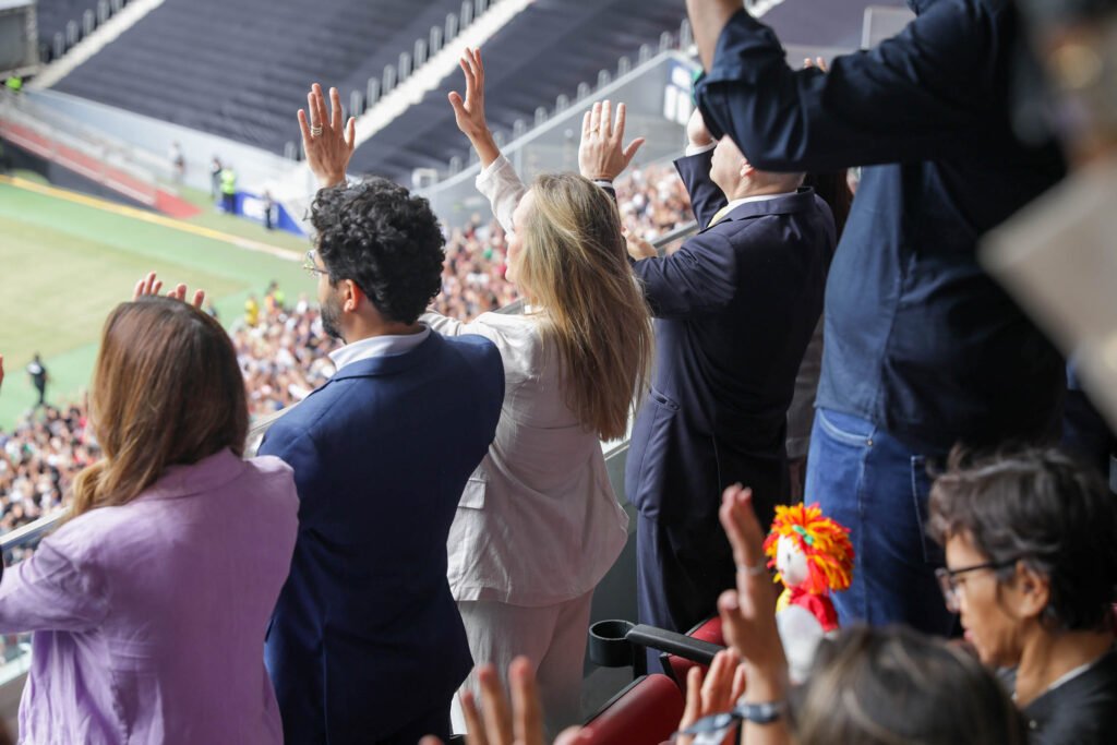 A governadora Celina Leão participou, nesta Sexta-feira Santa (3), do evento religioso Família ao Pé da Cruz, promovido pela Igreja Universal do Reino de Deus, na Arena BRB Mané Garrincha. A programação reuniu fiéis em um momento de oração e reflexão. O público foi estimado em mais de 70 mil pessoas.
