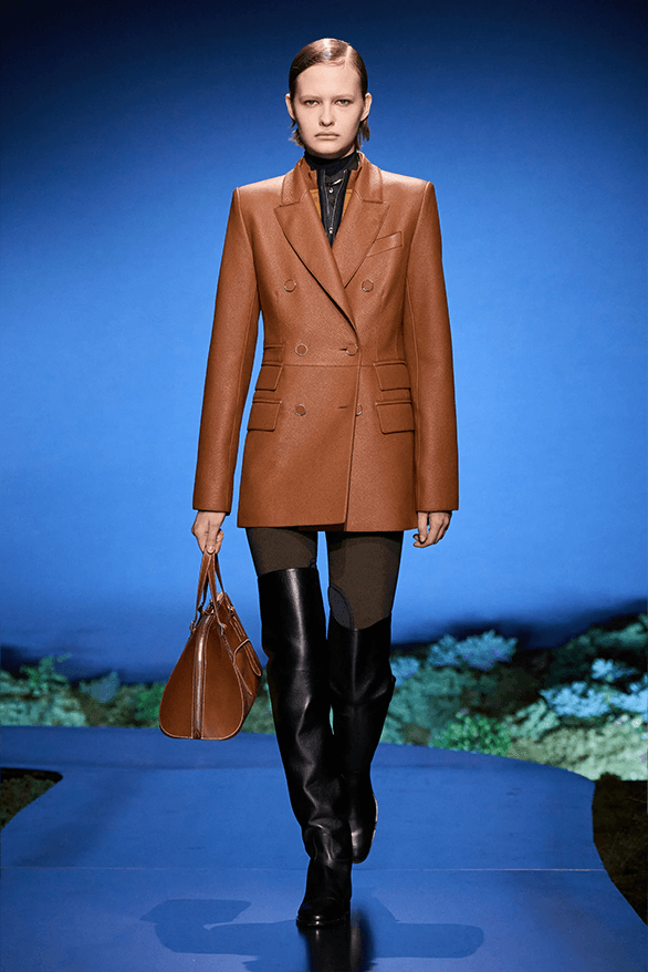 Entre os destaques da coleção estão os macacões confeccionados em couro, material que faz parte da essência da marca. A Hermès, que nasceu no século XIX produzindo artigos equestres, mantém até hoje o couro como um de seus maiores símbolos de qualidade e tradição.