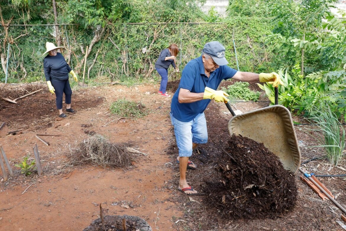 “É uma área de integração social, onde qualquer um pode participar. O pessoal 60+ tem mais participação do que de jovens e ocupa o tempo aqui. Tudo que produz fica para a comunidade, que usufrui das plantas para fazer chás de erva-cidreira, capim-santo, espinheira-santa e outras hortaliças”, observa. A farmacêutica reforça, ainda, que o sentimento de pertencimento e propósito aliado ao trabalho coletivo e ao contato com a natureza promove confiança, vínculos afetivos e saúde emocional.