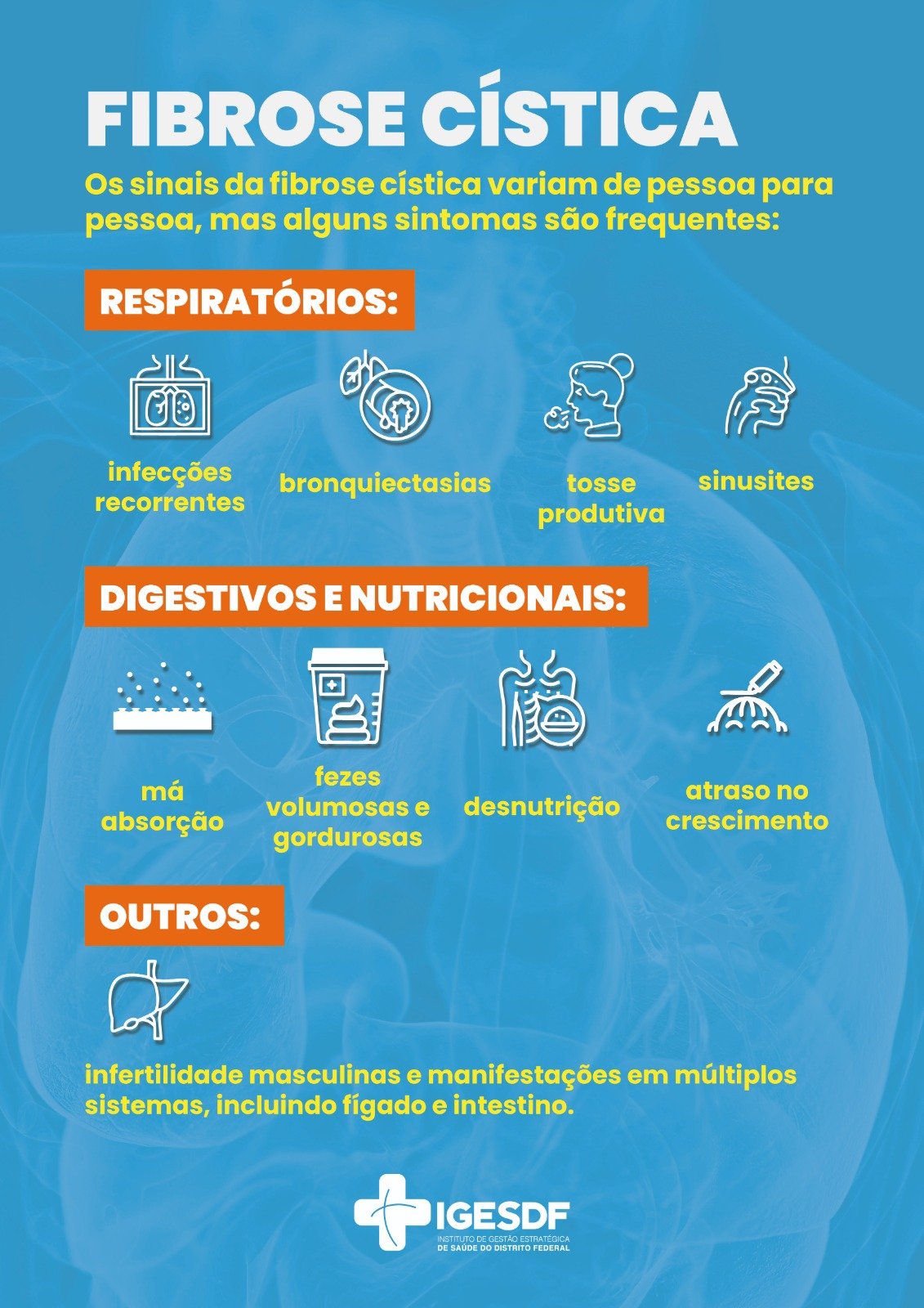 A doença provoca queda da qualidade de vida e aumento dos riscos de complicações graves e de morte, causando danos progressivos aos sistemas respiratório, digestivo e reprodutor masculino, além de perdas nutricionais. Por isso, a conscientização da sociedade é essencial.