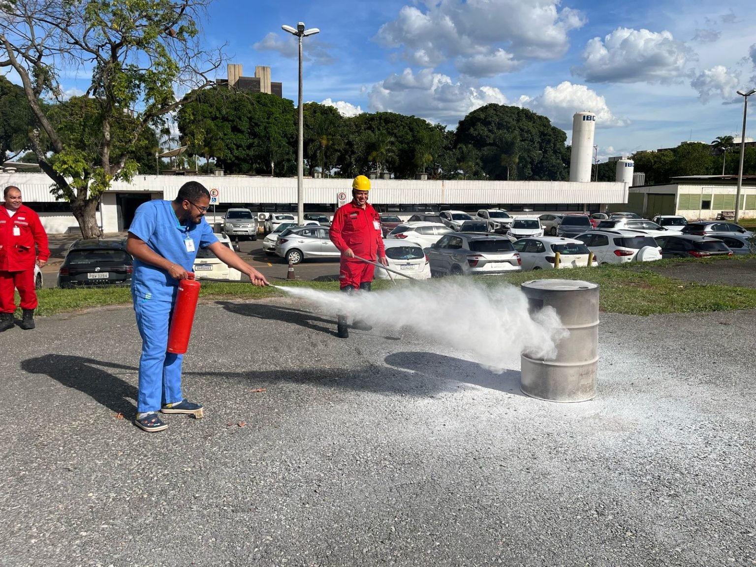 Colaboradores do Núcleo de Mobilidade (Numob) do Hospital de Base participaram de uma série de treinamentos com a Brigada de Incêndio do hospital nos últimos dias. Os maqueiros puderam aprender a manusear o extintor de incêndio, enfrentando uma situação simulada onde precisavam apagar o fogo provocado dentro de um tonel de aço localizado na área do estacionamento do HBDF.