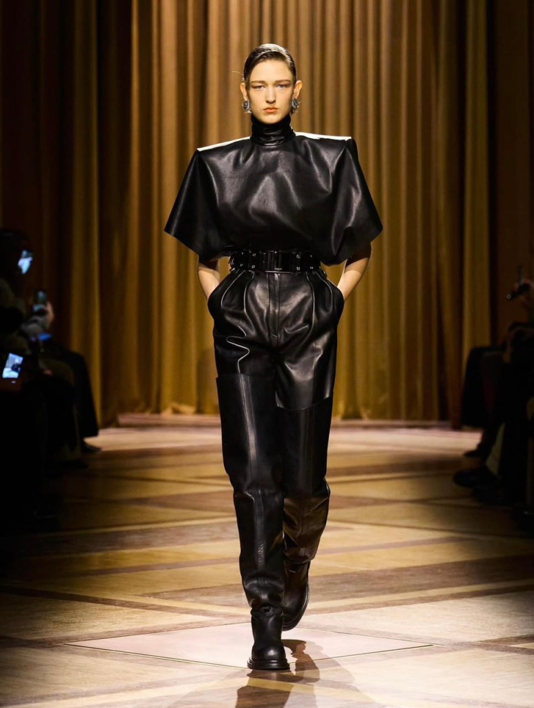 Mesmo com uma paleta mais sóbria, o toque de glamour característico da marca aparece em tecidos metalizados em dourado, bronze e rosa. O couro também ganha destaque, surgindo moldado ao corpo em peças de construção mais rígida, criando contraste entre volumes amplos e formas ajustadas.