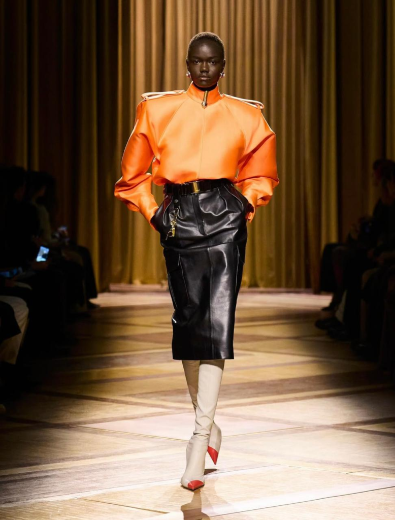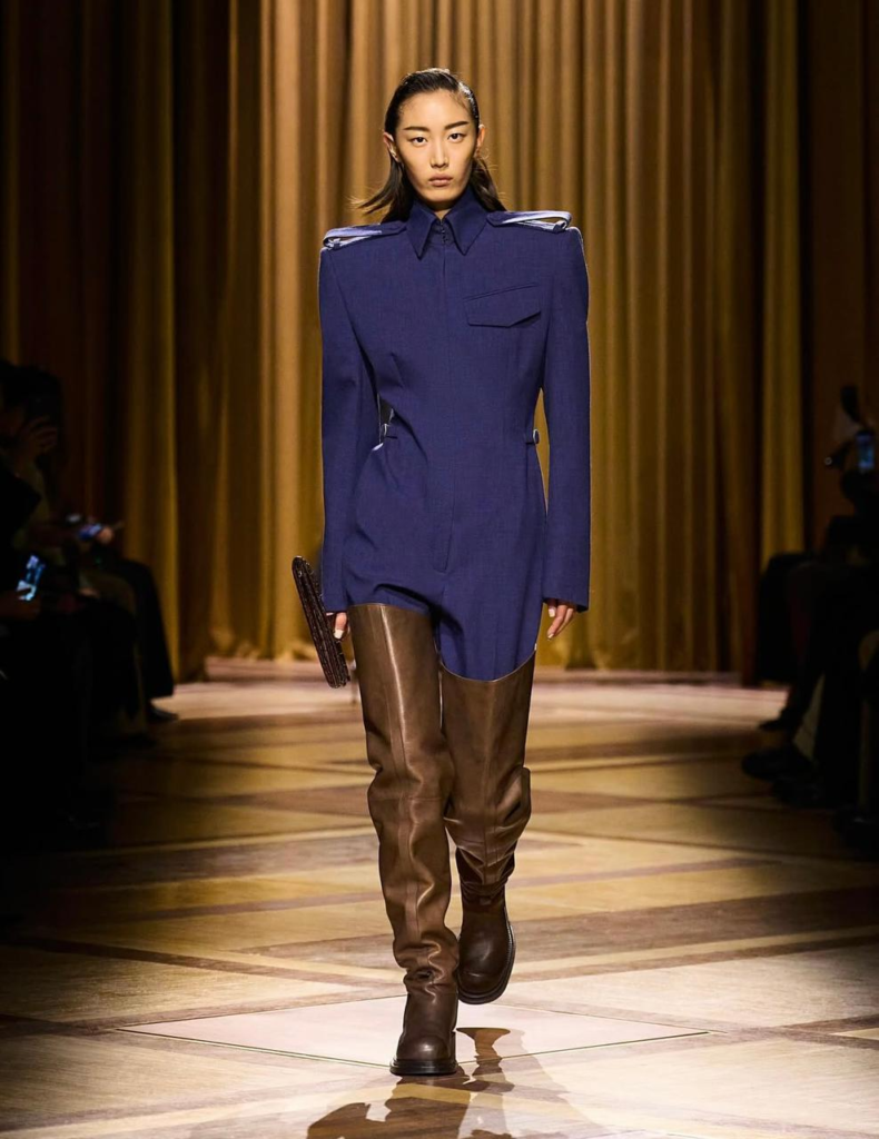 A alfaiataria surge como base da coleção. Casacos de volumes amplos, vestidos de linhas retas e conjuntos coordenados de jaqueta e saia aparecem em tons de caramelo, bege, azul intenso, roxo e preto. Ombreiras inspiradas em uniformes, golas altas e cinturas bem marcadas ajudam a construir uma silhueta imponente, enquanto bolsos utilitários e cintos largos acrescentam estrutura às peças.