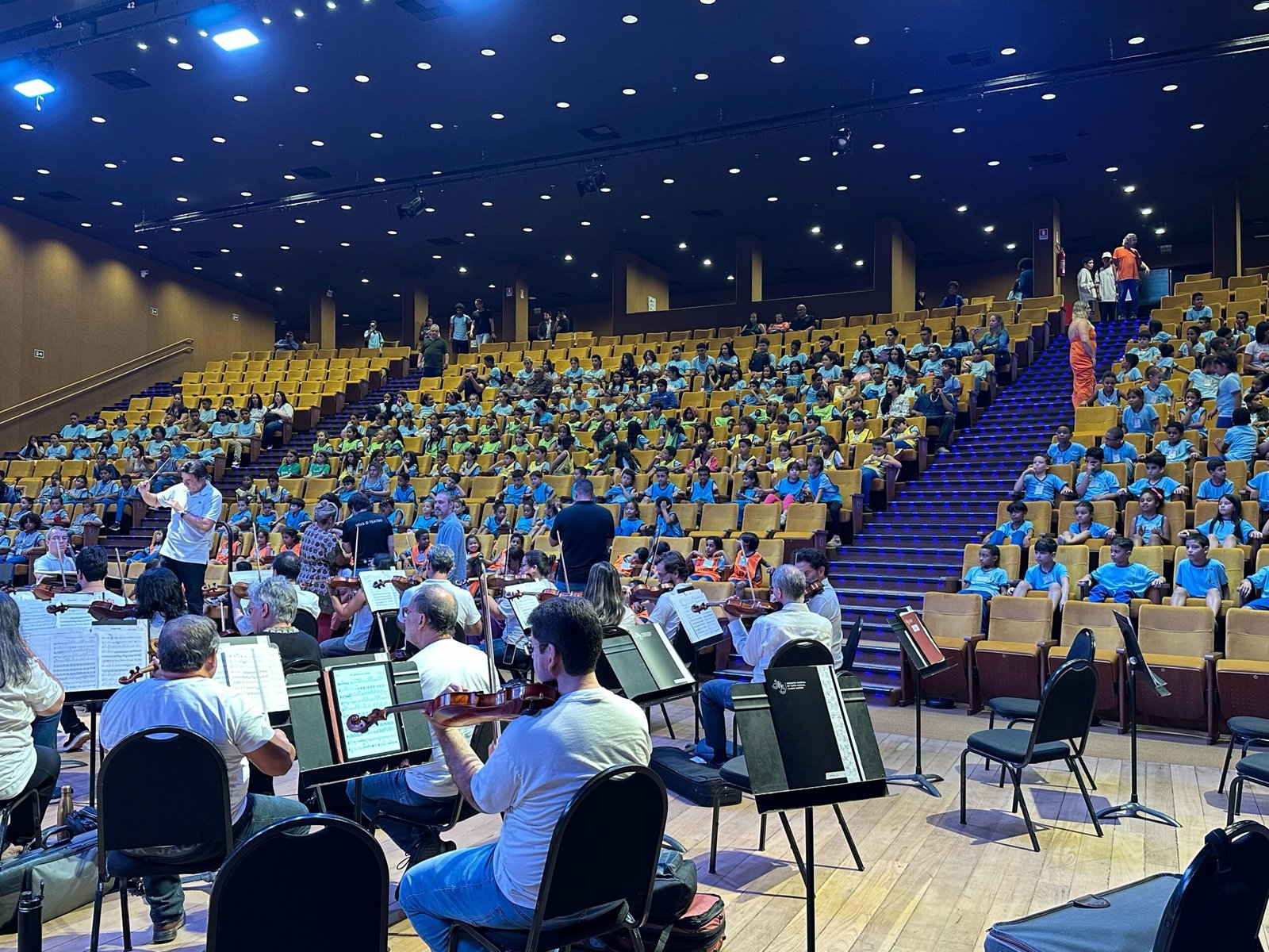 Musicalização e aprendizagem marcaram a tarde de cerca de cerca de 400 estudantes de escolas públicas de Sobradinho, Brazlândia e Planaltina nesta quarta-feira (30). Eles tiveram a oportunidade de mergulhar no universo da música clássica ao assistir a um concerto didático da Orquestra Sinfônica do Teatro Nacional Cláudio Santoro, sob a regência do maestro Cláudio Cohen. A apresentação foi realizada na Sala Martins Pena.