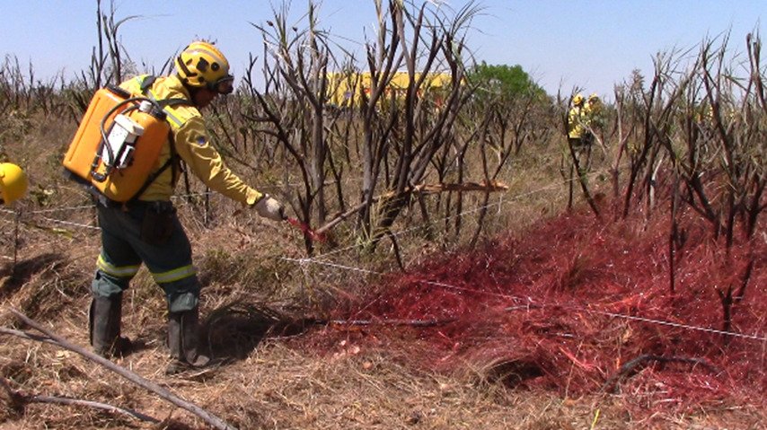 Os experimentos se distribuem em três frentes: combate indireto (aplica retardante com 24h de antecedência, isolando o efeito químico), combate direto terrestre (compara, em linhas de fogo idênticas, retardante e água, registradas por drones) e combate aéreo (testes com aeronaves do CBMDF, como o modelo AT802F, equipadas com telemetria e câmeras para medir precisão, distribuição e efeito sobre as chamas).