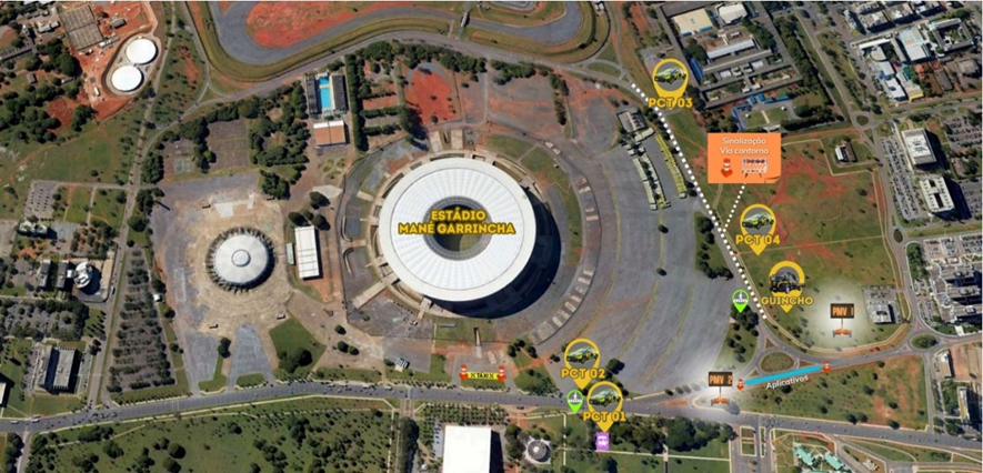 Na via N2, na altura da rotatória de acesso à via contorno da Arena BRB Mané Garrincha, será delimitada uma área de embarque para veículos de transporte de passageiros por aplicativo. Na entrada principal de automação da Arena BRB será sinalizada uma área para táxis.