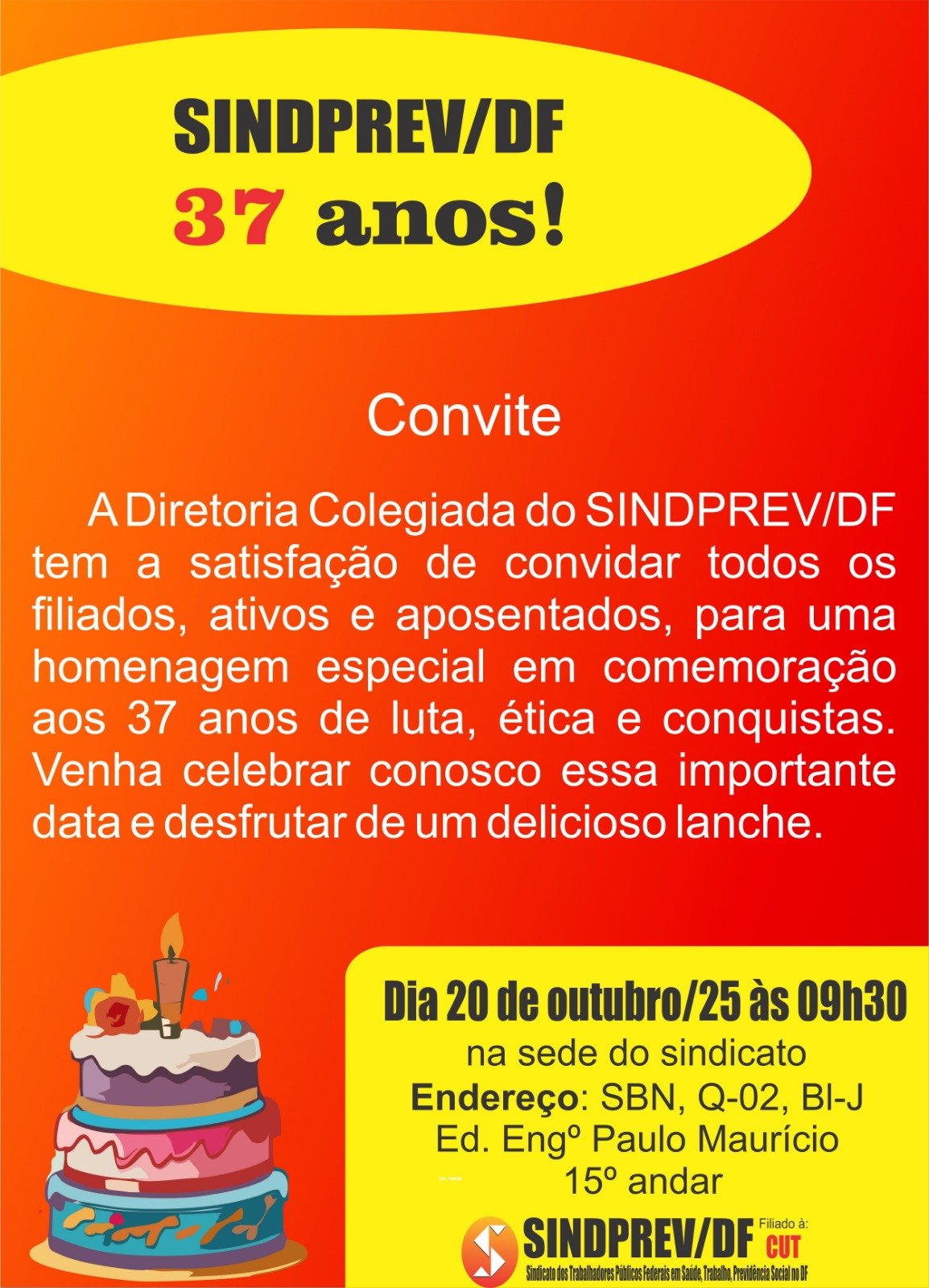 Para celebrar tão importante data para a luta pelos legítimos direitos da classe trabalhadora, a Diretoria Colegiada do SINDPREV/DF tem a satisfação de convidar todos os filiados, ativos e aposentados, para uma homenagem especial em comemoração às muitas vitórias que o sindicato conquistou para eles nestes 37 anos de luta e compromisso com as legítimas causas da classe.