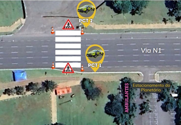 Na via N1, na altura do Planetário, e na via de contorno do Estádio Nacional de Brasília (ENB), os agentes implantarão sinalização para travessia de pedestres e para coibir estacionamento irregular. Na via N2, na altura da rotatória de acesso à via de contorno do ENB, será delimitada uma área de embarque para veículos de aplicativo. Já na entrada principal da Arena BRB será sinalizado espaço para táxis. O estacionamento do Planetário será reservado aos vendedores ambulantes.