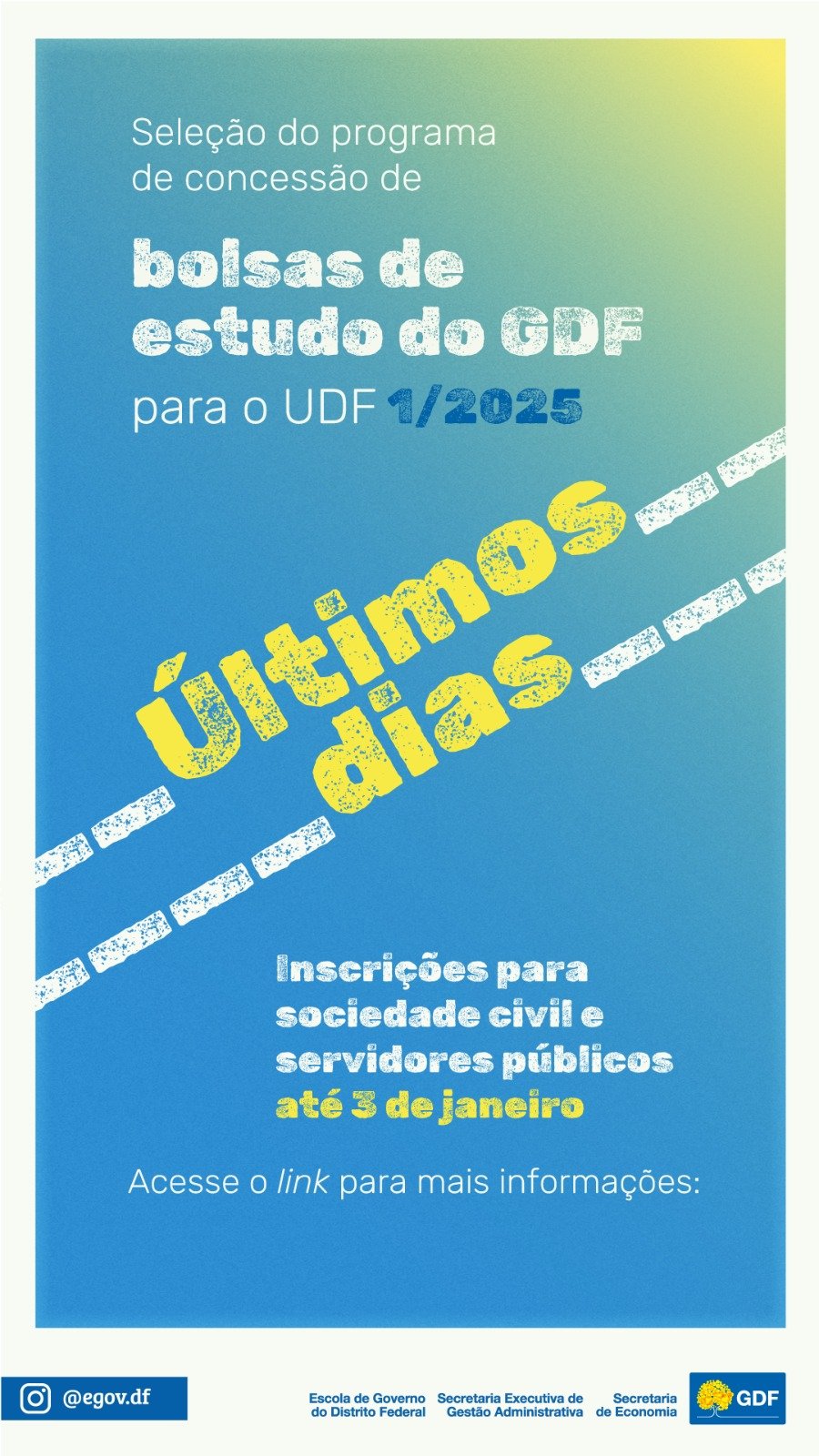 Coordenado pela Escola de Governo (Egov) , o programa de concessão de bolsas de estudo do Governo do Distrito Federal (GDF) está com inscrições abertas até esta sexta (3). São oferecidas 82 vagas no Centro de Ensino Unificado do Distrito Federal (UDF), destinadas a servidores e empregados públicos do DF e a ex-alunos de escolas da rede pública de ensino de todo o país.