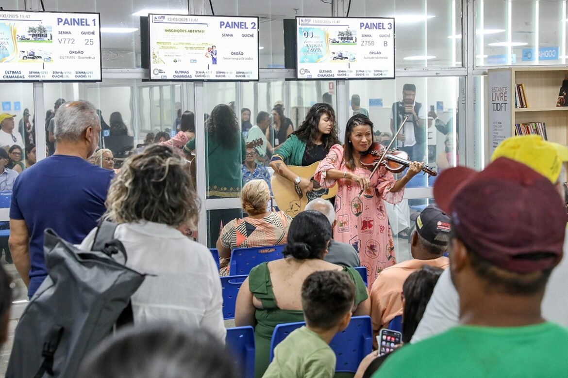 O atendimento no Na Hora da Rodoviária do Plano Piloto teve uma trilha sonora especial nesta quarta-feira (12). Com uma apresentação musical, a violonista Kathia Pinheiro retornou à unidade para retribuir a presteza e a gentileza que recebeu da equipe durante atendimento no mês passado. “Eu estava tentando resolver um problema há três meses e, em apenas 15 minutos, eles encontraram a solução. Fiquei muito emocionada e feliz”, conta Kathia.